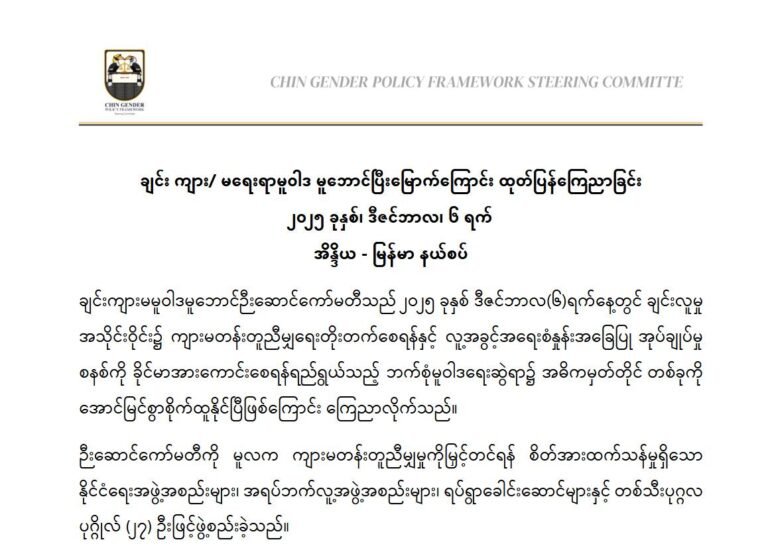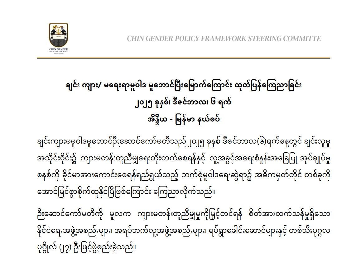 စစ်အာဏာရှင်တော်လှန်ရေး ငါးနှစ်နီးပါး ရှိလာချိန်တွင် ချင်းလူမှုအသိုင်းအဝိုင်းကြား လူ့အခွင့်အရေး၊ တန်းတူညီမျှမှု၊ တရားမျှတမှုနှင့် လွတ်လပ်မှုကို အခြေခံထားသော ချင်း ကျား/မရေးရာ မူဝါဒမူဘောင်ကို ချမှတ်နိုင်ပြီဟု ချင်းကျား မရေးရာမူဝါဒမူဘောင်လမ်းညွှန်ကော်မတီ (CGPFSC) ထံမှ သိရသည်။