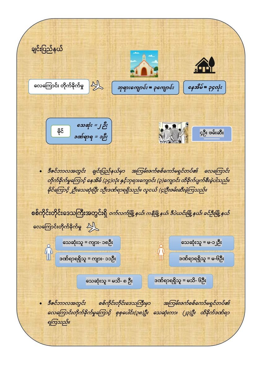 လေကြောင်းတိုက်ခိုက်မှုကြောင့် ချင်းပြည်နယ်တွင် ဘုရားကျောင်း (၃) ကျောင်း၊ လူနေအိမ် (၃၄) အိမ် ပျက်စီးဆုံးရှုံးခဲ့ရသည်ဟုလည်း ဆိုသည်။