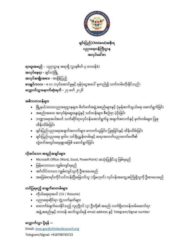 စိတ်ပါဝင်စားသူများအနေဖြင့် သက်ဆိုင်ရာ ဝန်ကြီးဌာနများ၏ အီးမေးလ်များဖြစ်သော moe.goc@chinlandcouncil.org (ပညာရေး) နှင့် dg@chinlandmohs.org (ကျန်းမာရေး) တို့သို့ ဆက်သွယ်လျှောက်ထားနိုင်ပါသည်။
