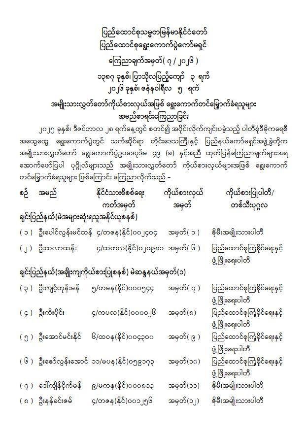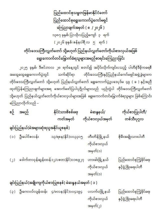 အချိုးကျကိုယ်စားပြုစနစ်အရ ချင်းပြည်နယ်၊ မဲဆန္ဒနယ်အမှတ် ၁ တွင် ကြံ့ခိုင်ရေးပါတီမှ ဦးကျင့်တုန်းမန်၊ ဦးကီးပိုင်း၊ ဦးအောင် မင်းနိုင်၊ ဦးဇော်လွန်းအောင်နှင့် ဇိုမီးအမျိုးသားပါတီမှ ဒေါ်ကျိန်ငိုက်မန်နှင့် ဦးနန်ခင်းဇမ်တို့ အနိုင်ရရှိသည်ဟု သိရသည်။