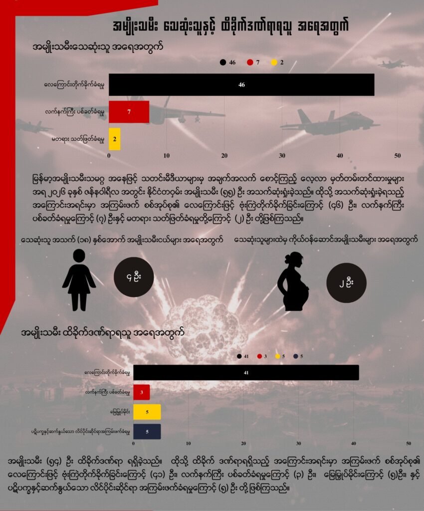 ပြီးခဲ့သည့် ဇန်နဝါရီလအတွင်း မြန်မာနိုင်ငံတဝှမ်းလုံးမှာ စစ်ကော်မရှင်၏ လေကြောင်း ဗုံးကြဲတိုက်ခိုက်မှုကြောင့် အမျိုးသမီး (၄၆) ဦး၊ လက်နက်ကြီးကြောင့် (၇) ဦး နှင့် မတရား သတ်ဖြတ်ခံရမှုကြောင့် (၂) ဦး စုစုပေါင်း ၅၅ ဦး တို့ အသက်ဆုံးရှုံးခဲ့ကြရသည်ဟု သိရသည်။
