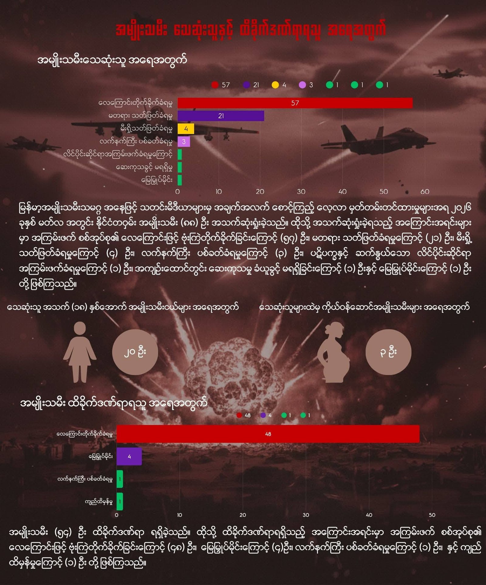 ထို့အပြင်လေကြောင်းတိုက်ခိုက်မှုကြောင့် အမျိုးသမီး (၄၈) ဦး၊ လက်နက် ကြီးပစ်ခတ်ခံရမှုကြောင့် (၁) ဦး၊ မြေမြှုပ်မိုင်းကြောင့် (၄) ဦး နှင့် ကျဉ်ထိခိုက်မှုကြောင့် အမျိုးသမီး (၁) ဦး စုစုပေါင်း (၅၄) ထိခိုက် ဒဏ်ရာရရှိခဲ့ကြသည်ဟု သိရသည်။