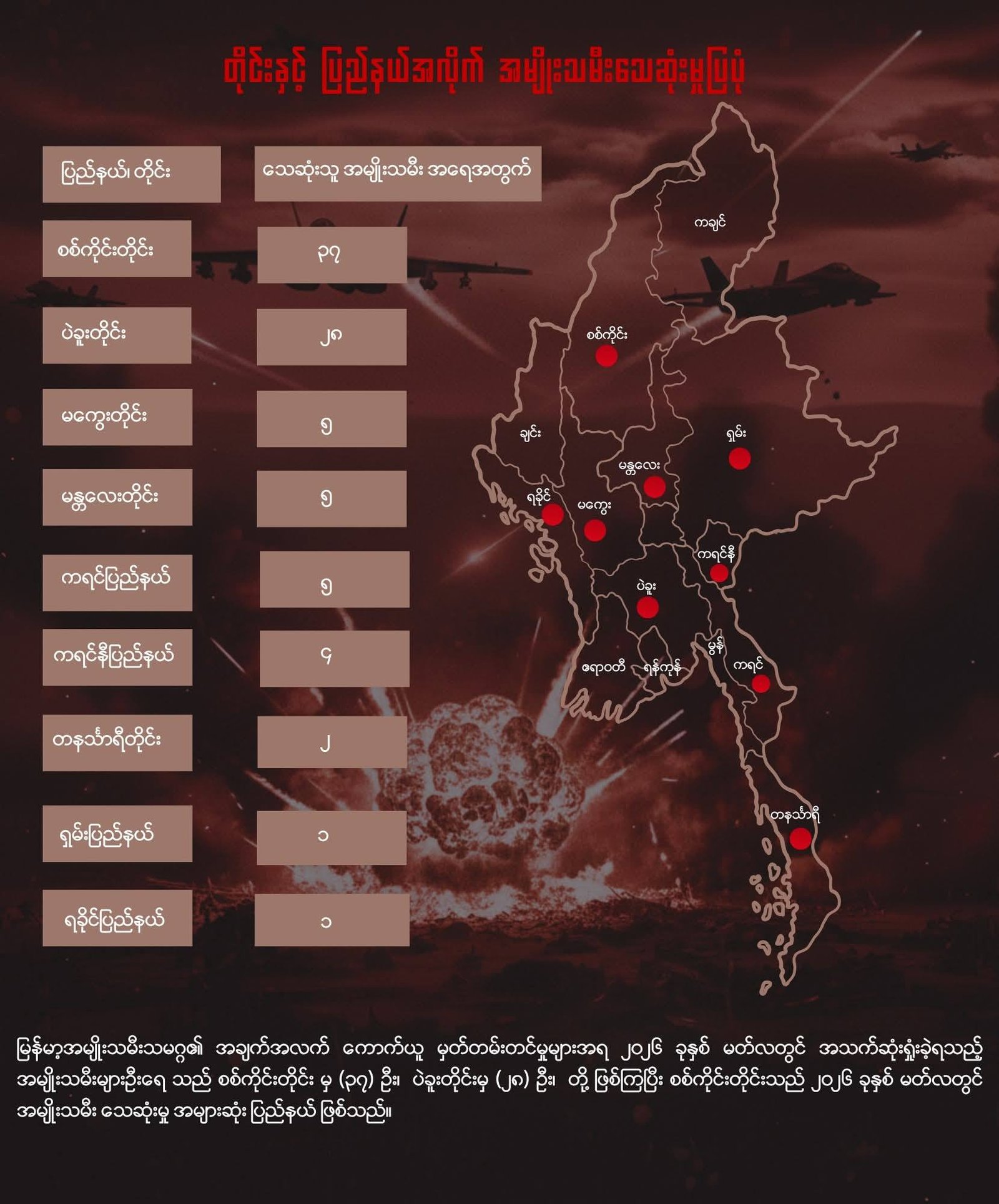 စစ်ကိုင်းတိုင်းတွင် အမျိုးသမီးသေဆုံးမှု (၃၇) ဦး၊ ပဲခူးတိုင်း တွင် (၂၈) ဦး၊ မကွေး တိုင်း တွင် (၅) ဦး၊ မန္တလေးတိုင်းတွင် (၅) ဦး၊ ကရင်ပြည်နယ်တွင် (၅) ဦး၊ ကရင်နီပြည်နယ်တွင် (၄) ဦး၊ တနသ်ာရီတိုင်း တွင် (၂) ဦး၊ ရှမ်းပြည်နယ်တွင် (၁) ဦး၊ ရခိုင်ပြည်နယ် (၁) ဦး တို့သေဆုံးခဲ့သည်။
