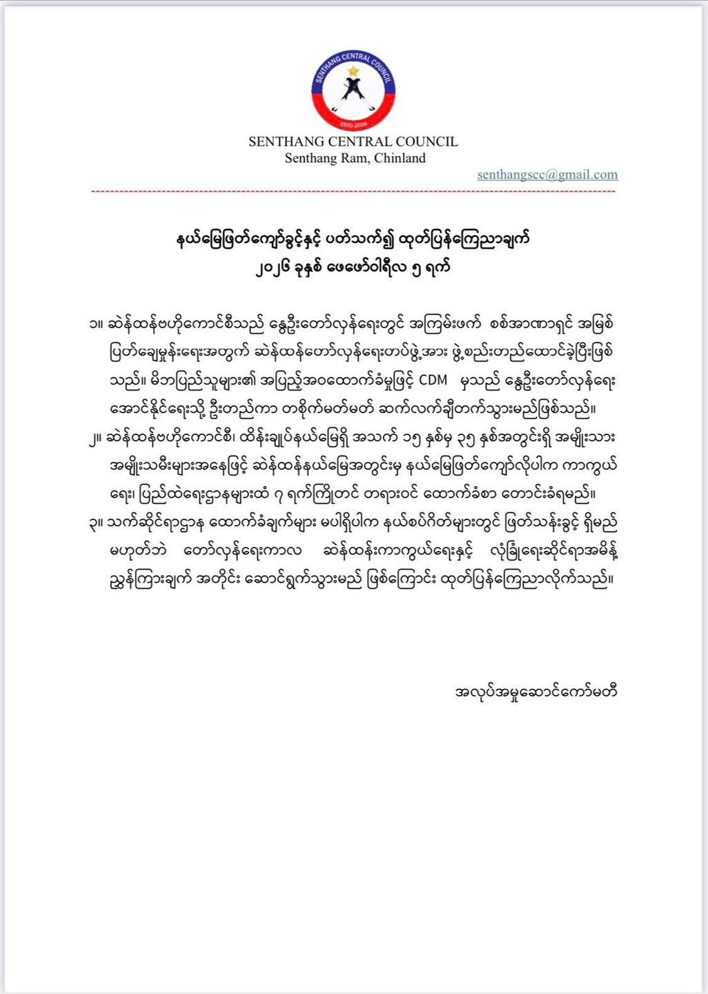 ဆဲန်ထန်းဗဟိုကောင်စီသည် နွေဦးတော် လှန်ရေးအတွင်း အကြမ်းဖက်စစ်အာဏာရှင်အမြစ်ပြတ်ခြေမှုန်းရေး အတွက် ဆဲန်ထန်းတော်လှန်ရေးတပ်ဖွဲ့ ( Senthang Revolution Force ) အားဖွဲ့စည်းခဲ့ခြင်းဖြစ်ပြီး ပြည်သူများထောက်ခံမှုဖြင့် (CDM) မှ နွေဦးတော်လှန် ရေးအောင်နိုင်ရေးသို့ ဦးတည်ကာ တစိုက်မတ်မတ်ဆက်လက်ချီတက်သွားမည်ဖြစ်ကြောင်း ဖော်ပြထားသည်။