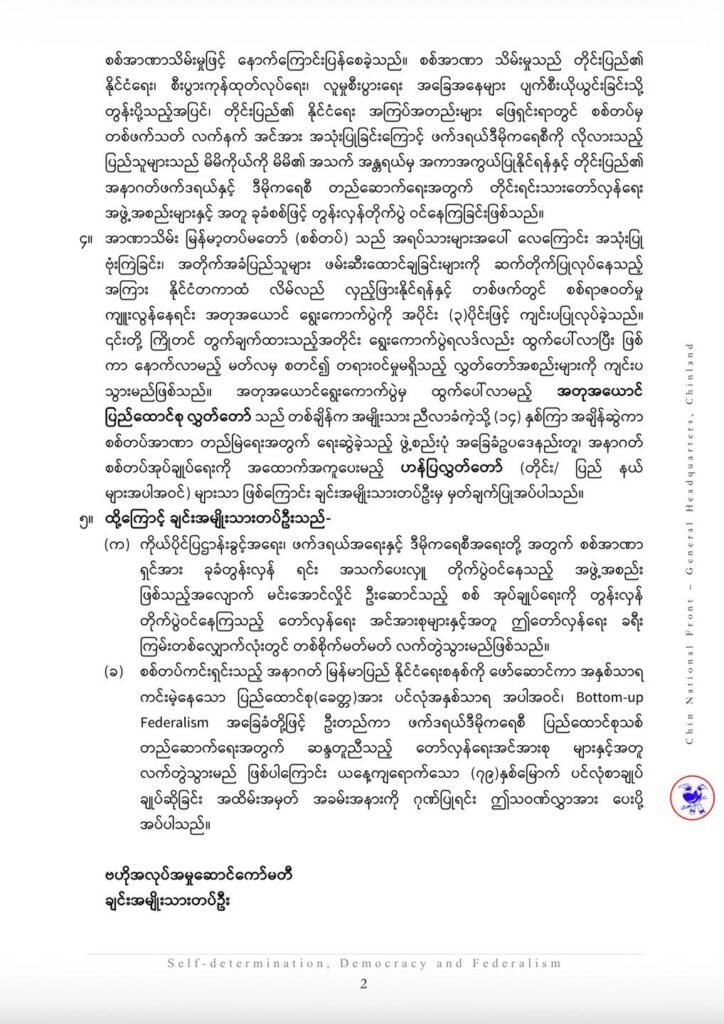 ပင်လုံအနှစ်သာရ ပါဝင်သည့် Bottom- Up ဖက်ဒရယ်ဝါဒကို အခြေခံဦးတည်ကာ ဖက်ဒရယ် ဒီမိုကရေစီ ပြည်ထောင်စုသစ် တည် ဆောက်ရေးအတွက် ဆန္ဒတူညီသော တော်လှန်ရေး အင်အားစုများနှင့် ပူးပေါင်းဆောင်ရွက်သွားမည်ဟု ချင်းအမျိုးသားတပ်ဦး CNF က ကြေညာသည်။