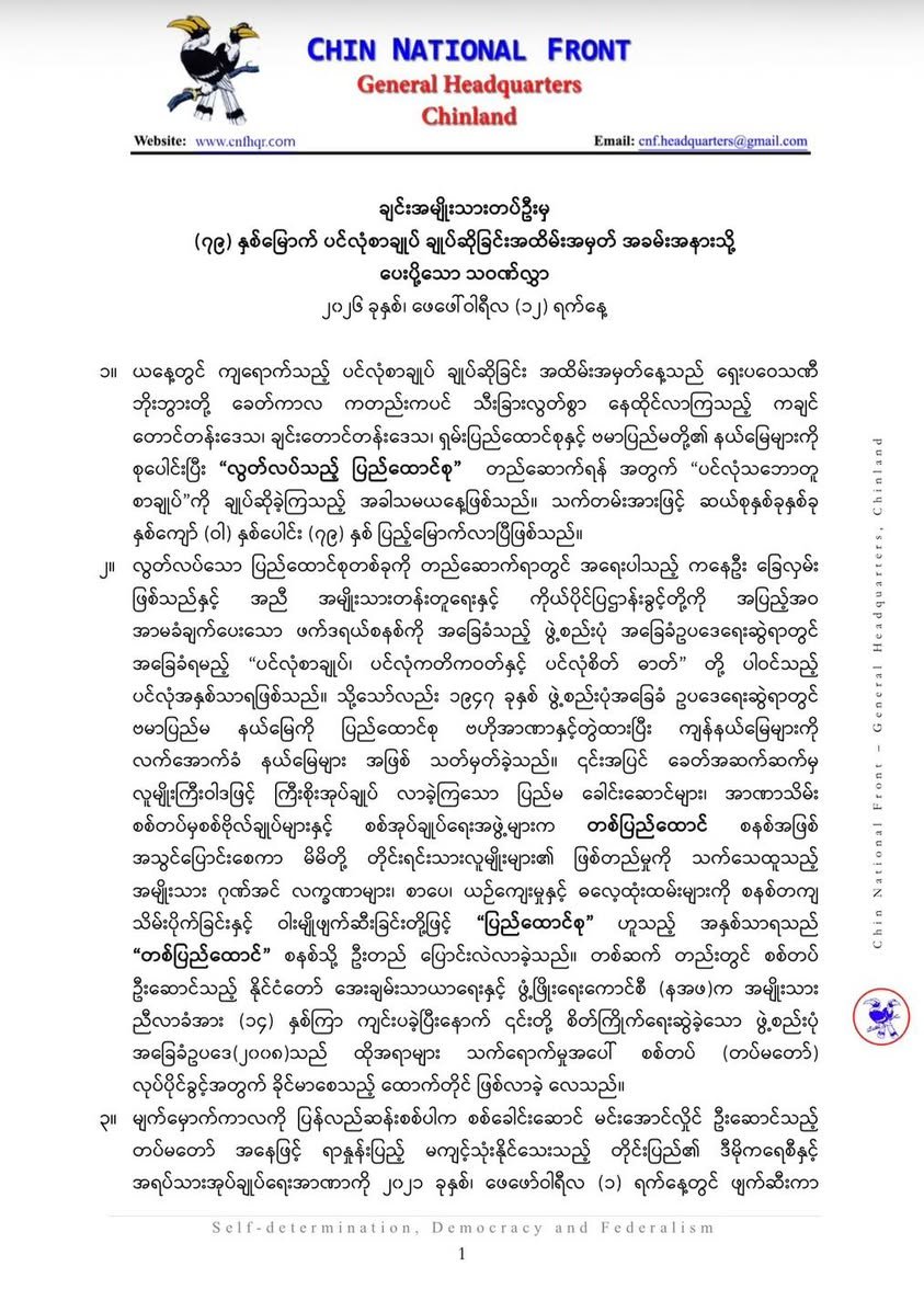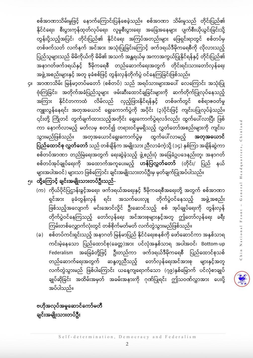 ပင်လုံအနှစ်သာရ ပါဝင်သည့် Bottom- Up ဖက်ဒရယ်ဝါဒကို အခြေခံဦးတည်ကာ ဖက်ဒရယ် ဒီမိုကရေစီ ပြည်ထောင်စုသစ် တည် ဆောက်ရေးအတွက် ဆန္ဒတူညီသော တော်လှန်ရေး အင်အားစုများနှင့် ပူးပေါင်းဆောင်ရွက်သွားမည်ဟု ချင်းအမျိုးသားတပ်ဦး CNF က ကြေညာသည်။