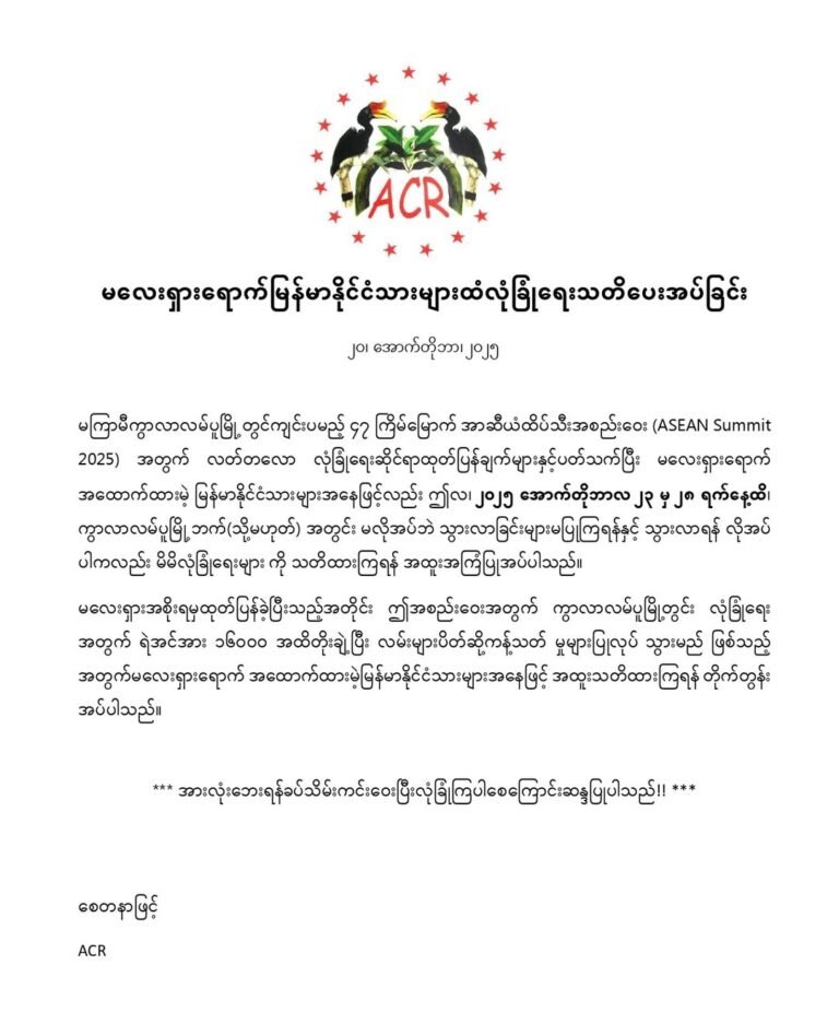 မလေးရှားနိုင်ငံ၊ ကွာလာလမ်ပူမြို့တွင် ကျင်းပမည့် ၄၇ ကြိမ်မြောက် အာဆီယံထိပ်သီးအစည်းအဝေး (ASEAN Summit 2025) ကာလအတွင်း လုံခြုံရေးဆိုင်ရာ ကန့်သတ်ချက်များ နှင့် လမ်းပိတ်ဆို့မှုများ အတွက် မလေးရှားရောက် မြန်မာဒုက္ခ သည်များအားလုံး အထူးသတိထားကြရန် Alliance of Chin Refugee (ACR) က အောက်တိုဘာလ ၂၀ ရက်နေ့တွင် သတိပေးချက် ထုတ်ပြန်လိုက်သည်။