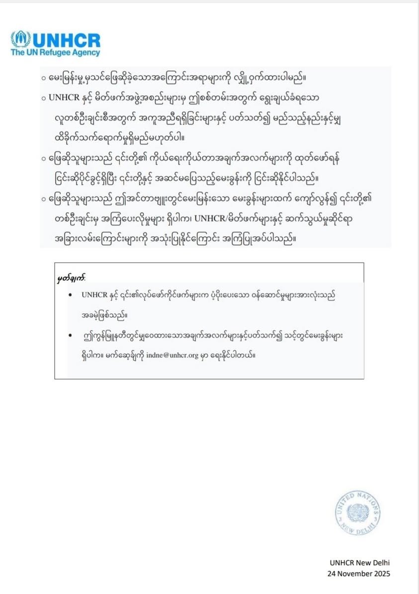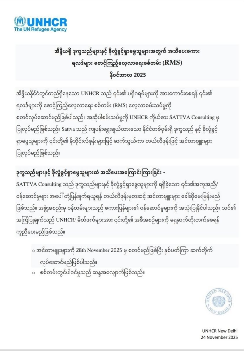 အိန္ဒိယနိုင်ငံ နယူးဒေလီမြို့ အခြေစိုက် ကုလသမဂ္ဂ ဒုက္ခသည်များဆိုင်ရာ မဟာမင်းကြီးရုံး (UNHCR) သည် နိုင်ငံတစ်ဝှမ်းရှိ ဒုက္ခသည်များနှင့် ခိုလှုံခွင့်တောင်းခံသူများအား နှစ်ပါတ်ကြာ ရလဒ်များ စောင့်ကြည့်လေ့လာရေး (Results Monitoring Survey – RMS) RMS စစ်တမ်းကောက်ယူမည်ဟု နိုဝင်ဘာလ ၂၄ ရက်နေ့က ကြေညာသည်။