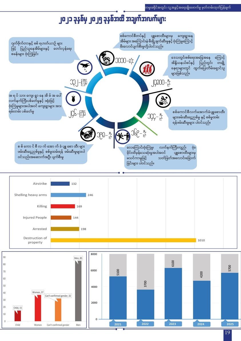 ၂၀၂၁ ခုနှစ်မှ ၂၀၂၅ ခုနှစ် နှစ်ကုန်အထိ စစ်ရေးပဋိပက္ခကြောင့် ဒေသအတွင်း လူဦးရေ (၂၄,၈၀၀) ခန့် အိုးအိမ်စွန့်ခွာ စစ်ဘေးရှောင်ကြရပြီး စစ်ကော်မရှင်တပ်၏ လေကြောင်းတိုက်ခိုက်ခြင်း၊ လက်နက်ကြီးပစ်ခတ်ခြင်း၊ သတ်ဖြတ် ခြင်းနှင့် ၎င်းတို့လက်အောက်ခံ ပျူစောထီးအဖွဲ့များ၏ မတရားဖမ်းဆီး ရိုက်နှက် သတ်ဖြတ်မှုများအပြင် မြေမြှုပ်မိုင်းများကြောင့် အမျိုးသမီးနှင့် ကလေးများအပါအဝင် အပြစ်မဲ့ပြည်သူ (၁၆၉) ဦး သေဆုံးခဲ့ရသည်ဟု အစီရင်ခံစာမှာ ဖော်ပြထားသည်။