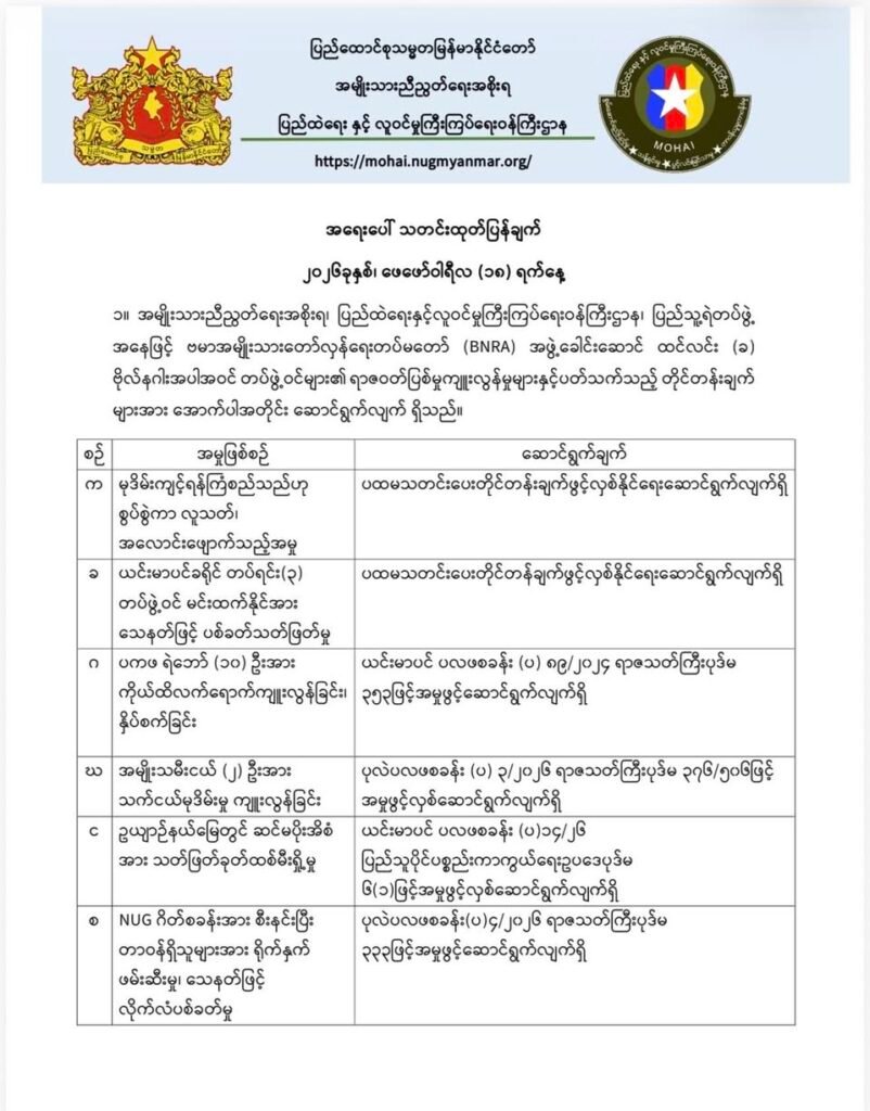 ဗိုလ်နဂါးနှင့်တပ်ဖွဲ့ဝင်တချို့သည် ရာဇဝတ်ပြစ်မှု ၇ ခု ကျူးလွန်ထားဟု NUG ထုတ်ပြန်
