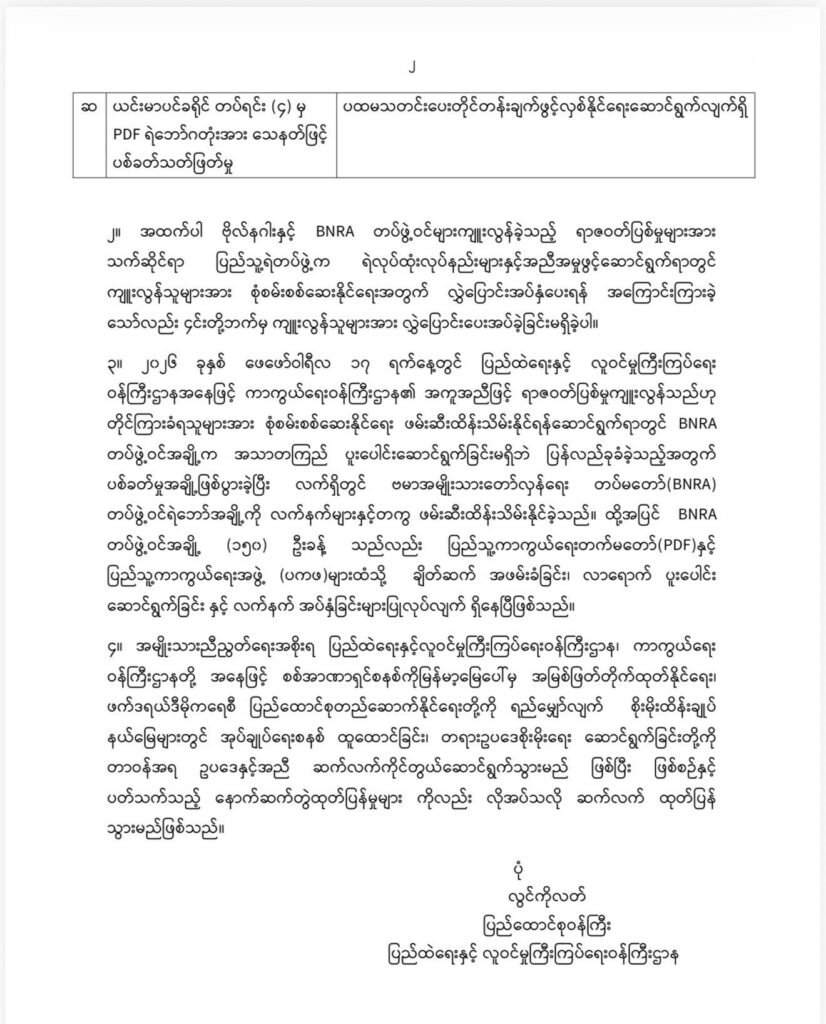 အမျိုးသားညီညွတ်ရေးအစိုးရ (NUG) ၏ ပြည်ထဲရေးဝန်ကြီးဌာနနှင့် ကာကွယ်ရေးဝန်ကြီးဌာန ပူးပေါင်းတပ်ဖွဲ့များသည် BNRA တပ်ဖွဲ့က ကျူးလွန်ခဲ့သော ရာဇဝတ်မှုများနှင့် ပတ်သက်၍ ဖမ်းဆီးထိန်းသိမ်း စစ်ဆေးနိုင်ရန် ဆောင်ရွက်လျက်ရှိကြောင်း NUG ဝန်ကြီးချုပ်ရုံး ပြောရေးဆိုခွင့်ရှိသူ ဦးနေဘုန်းလတ်က သတင်းမီဒီယာတချို့တွင် ဖြေကြားထားသည်။