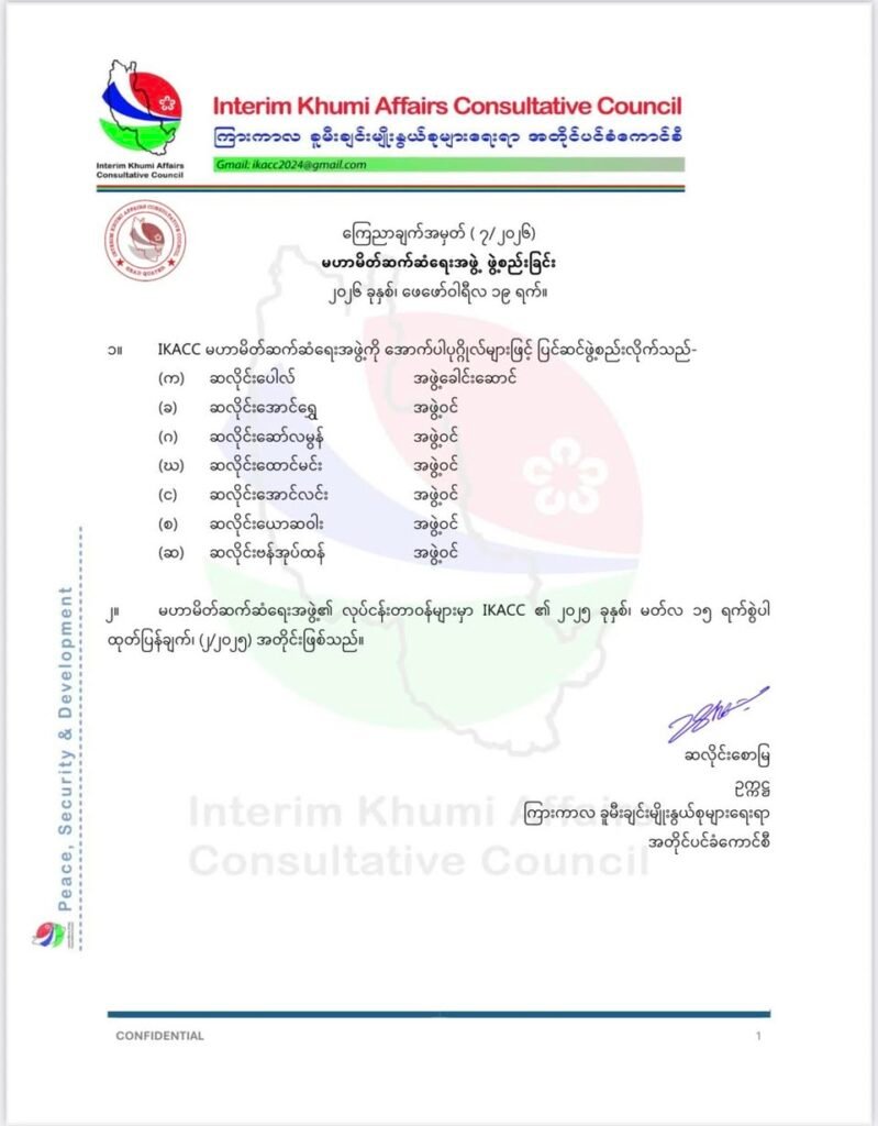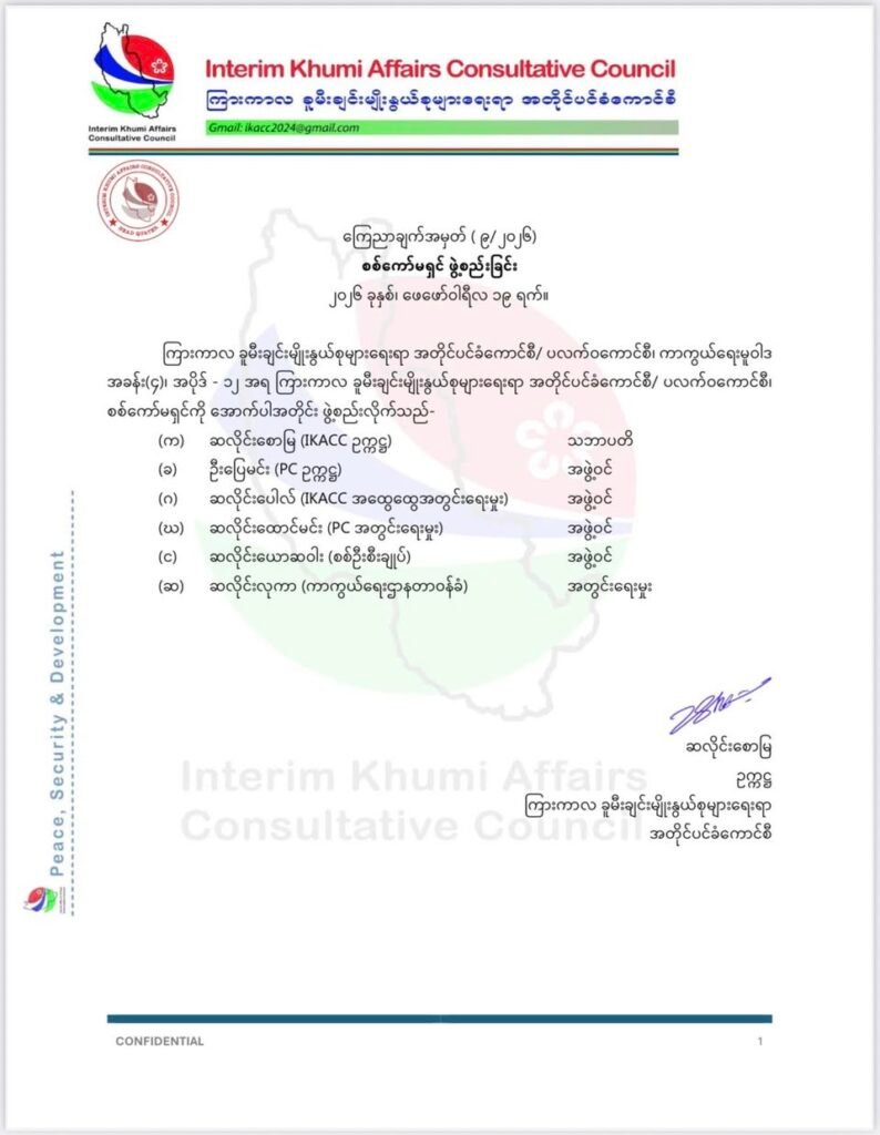 ကြားကာလ ခူမီးချင်းမျိုးနွယ်စုများ ရေးရာ အတိုင်ပင်ခံကောင်စီ (IKACC) က ကောင်စီတွင်းအပြောင်းအလဲတချို့ပြုလုပ်ကာ စစ်ကော်မရှင်အဖွဲ့နှင့် မဟာမိတ်ဆက်ဆံရေးအဖွဲ့တို့ကို ပြင်ဆင်ဖွဲ့စည်းလိုက်ကြောင်း ထုတ်ပြန်ကြေညာသည်။