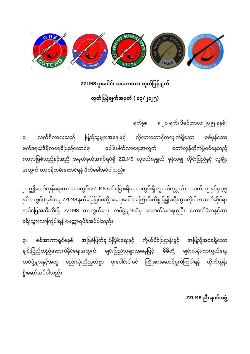 ချင်းပြည်နယ်အလယ်ပိုင်း ZZLMS ဒေသဟုခေါ်ဆိုသော ဇိုတုန်၊ ဇိုဖေ၊ လောက်တူ၊ မရာနှင့် ဆဲန်ထန်းဒေသရှိ စစ်မှုထမ်းရန် အကျုံးဝင်သော လူငယ်လူရွယ်အားလုံးသည် ၎င်းတို့နယ်မြေပြင်ပသို့ ခရီးသွားလိုပါက သက်ဆိုင်ရာ ချင်းကာကွယ်ရေးတပ်ဖွဲ့၏ ထောက်ခံစာနှင့်သာ ခရီးသွားလာရန် ZZLMS ညီနောင်အဖွဲ့က ကြေညာသည်။